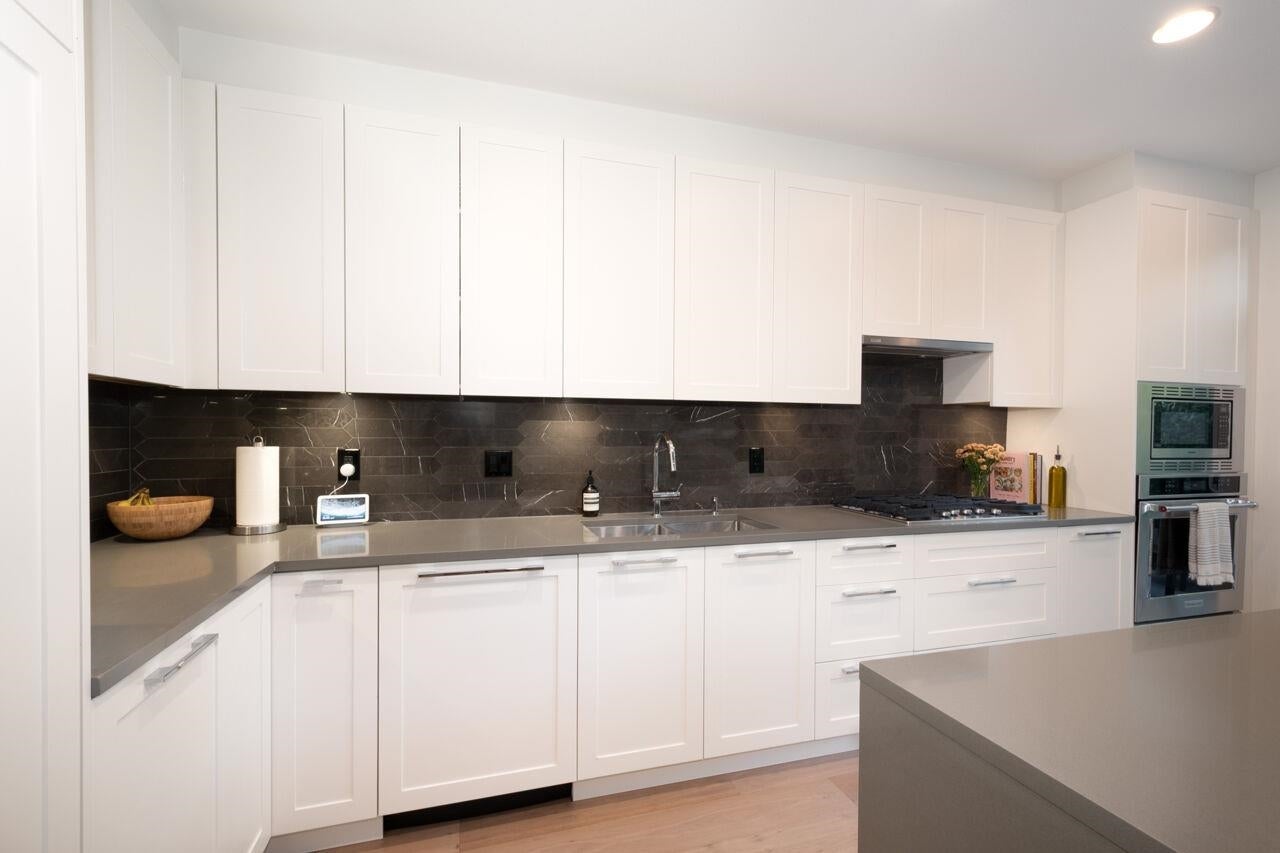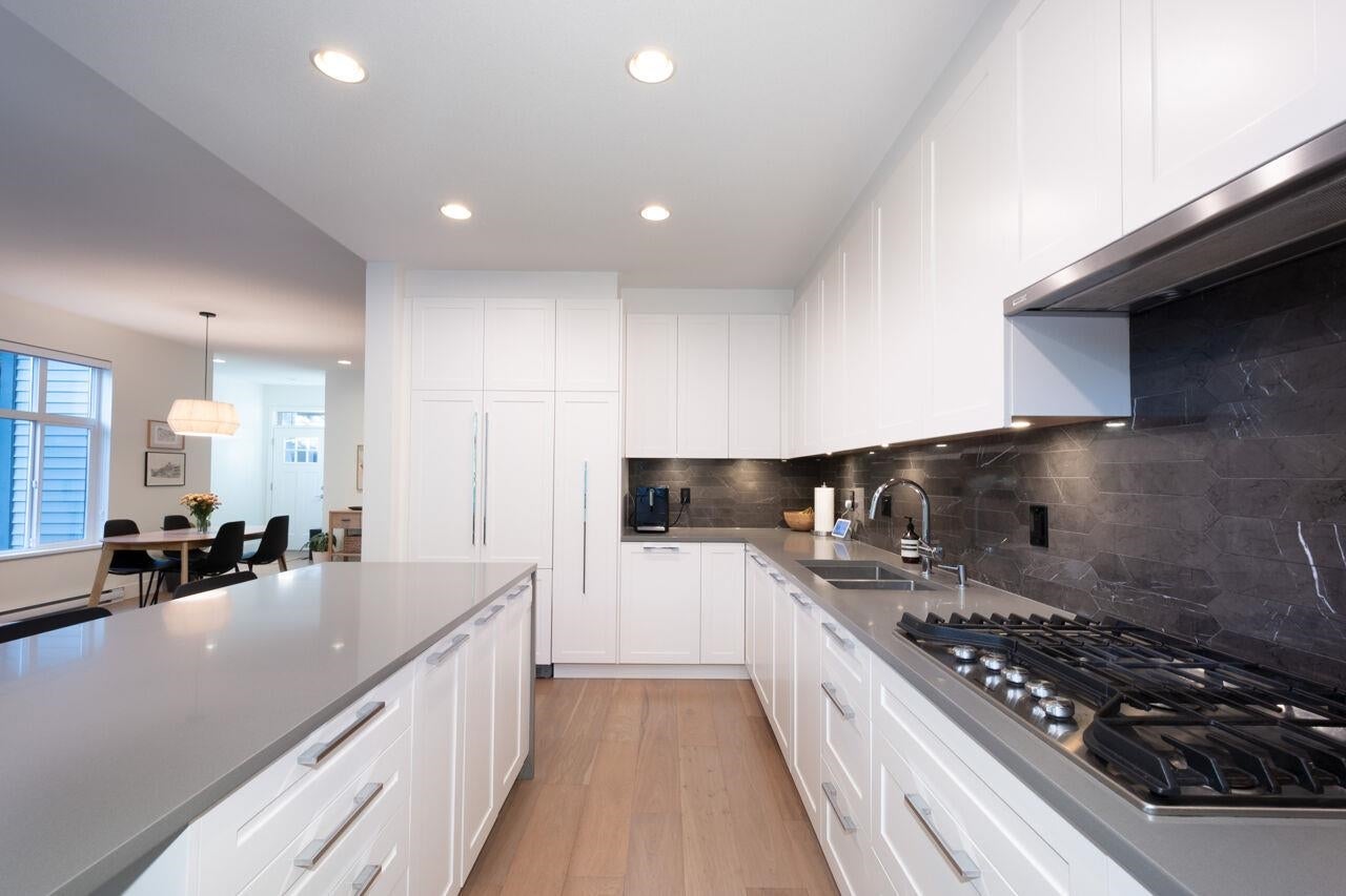 FABULOUS, DUPLEX STYLE TOWNHOME IN COVETED HADLEIGH ON THE PARK!! This immaculate home boasts privacy and serenity as it's nestled against the greenbelt...walk out to trails from your own fenced yard! Upscale, Tudor inspired complex boasts a great location across from Pioneer Park. Main level features eng. white oak flooring, gorgeous Chef's kitchen with entertaining island, stone counters, custom white cabinetry, and upscale, panelled appliances. Oversized windows bring in abundant natural light and lovely greenbelt views! Up are 3 generous bedrooms, each with an ensuite. Primary has a huge walk-in closet and a gorgeous ensuite. Lower level is bright and offers large Rec Room, a large bedroom w/walk-in closets and full bath. Walk out to your private yard, enhanced with artificial turf!